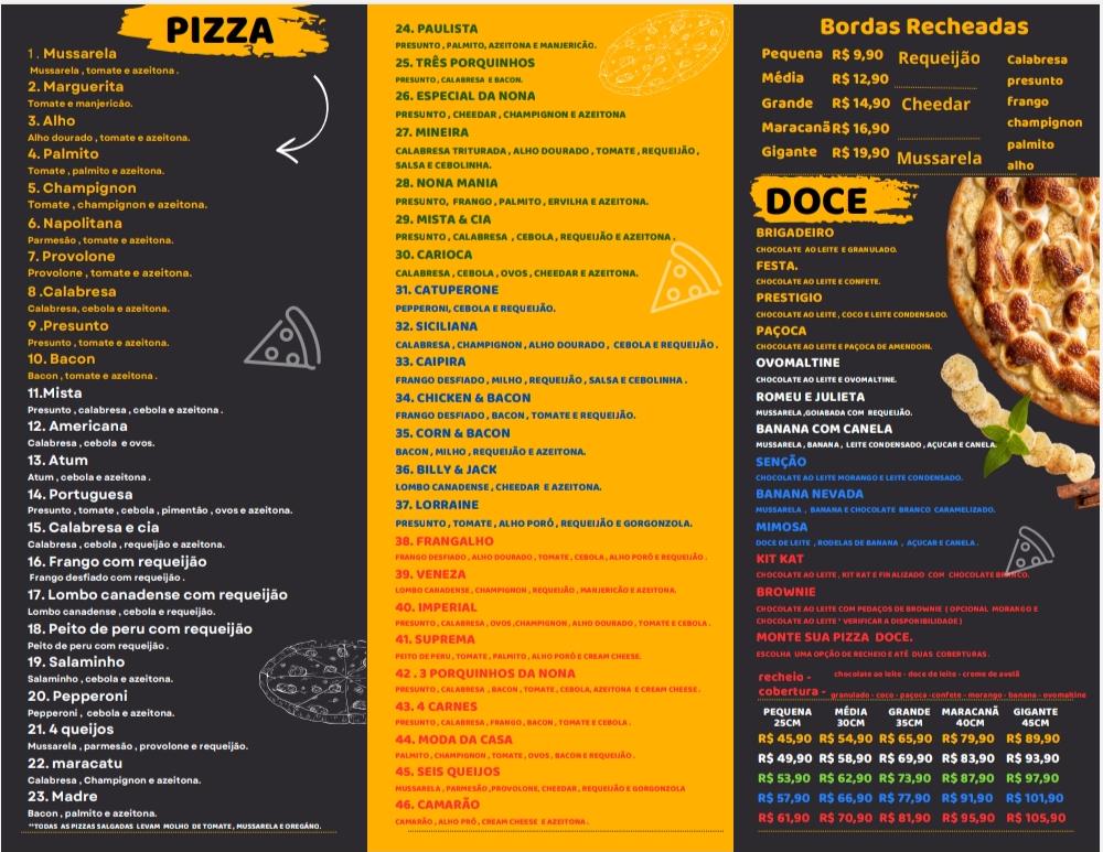 The menu at Nona Mania Pizzaria offers a delightful selection of artisanal pizzas, each crafted with quality ingredients and a touch of traditional Italian flavor. Among the highlights are the Pizza Três Porquinhos, featuring a rich combination of flavors, and the classic Pizza meia Marguerita e meia Portuguesa, offering the best of both worlds with a half Marguerita and half Portuguese topping. For fans of spicier options, the Pizza Calabresa stands out, delivering a savory experience with its distinctive taste. Another favorite is the indulgent Pizza 4 Queijos, perfect for cheese lovers. With its diverse range of options, Nona Mania Pizzaria caters to various tastes, ensuring that every pizza enthusiast finds something to enjoy.